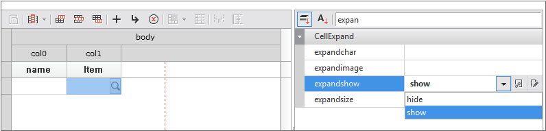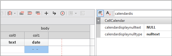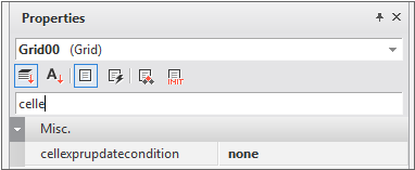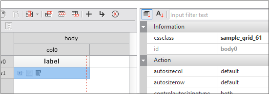 In the case of setting in the form of components such as combo, date, tree, etc. among several types, separate Cell properties must be set. Cell properties can be set in Grid Contents Editor. After selecting the corresponding Cell, detailed settings can be made in the GridCombo, GridDate, and GridTree categories in the Properties window.