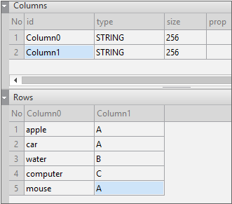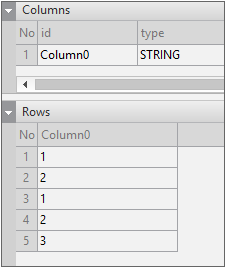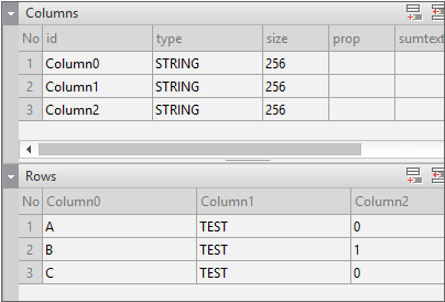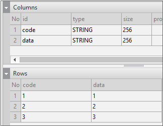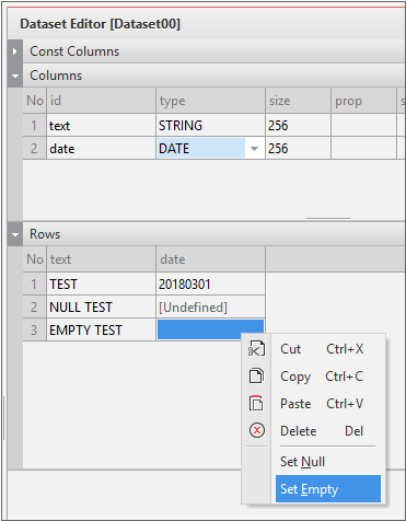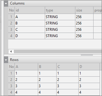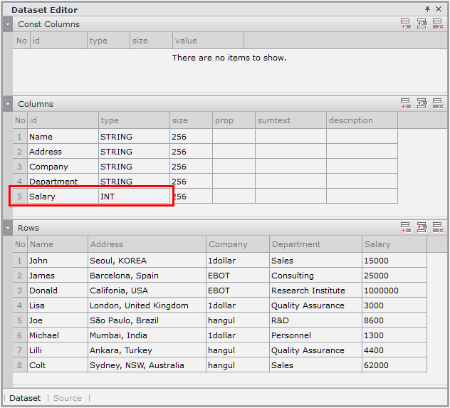 Enter the data item list in the created Dataset. If you double-click Dataset in the Invisible Objects area, then the Dataset Editor appears. Enter Columns and Rows as shown in the figure below.