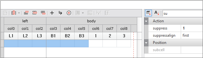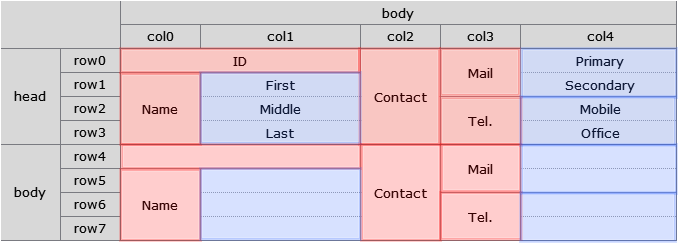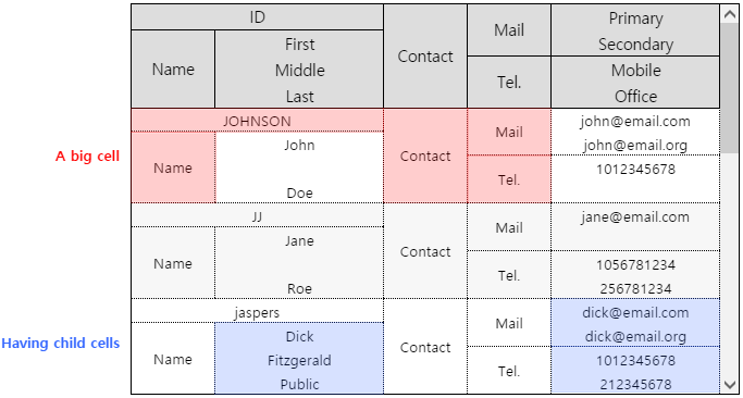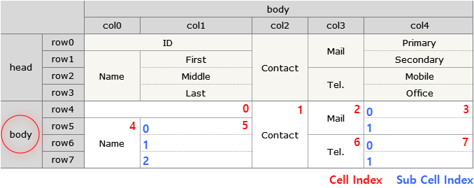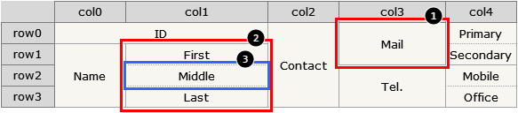 In the example, horizontally merged cells like First, Middle, and Last allow you to calculate subcell information using column values as shown below, but this doesn't work for vertically merged cells.