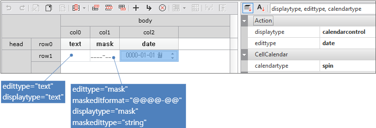 displaytype is the property that sets the format for displaying the contents of Cell on the screen. It can be set in the form of text such as normal, currency, date, number, text, etc., as well as the form of components such as combo, checkbox, button, tree, etc.