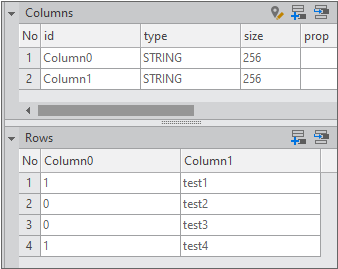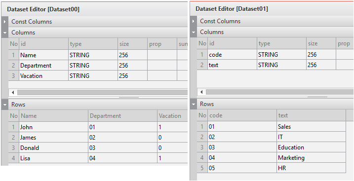 The following shows the Column structure of Dataset00 and Dataset01. Since they have different data and Column structures, they cannot be used by sharing the same format.