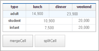 When the mergeCell button is clicked, adjacent cells with identical data are merged and displayed as a single cell.