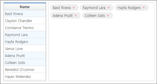 This transfers the area information selected in the Grid component to the MultiCombo component to be displayed in the form of a tag.