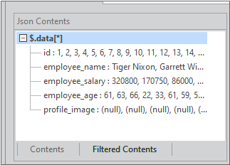 When the DataObject Path value is set to "$.code[*]", click the [Refresh json contents] button and check that the data is displayed in the [Filtered Contents] tab as shown below.