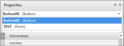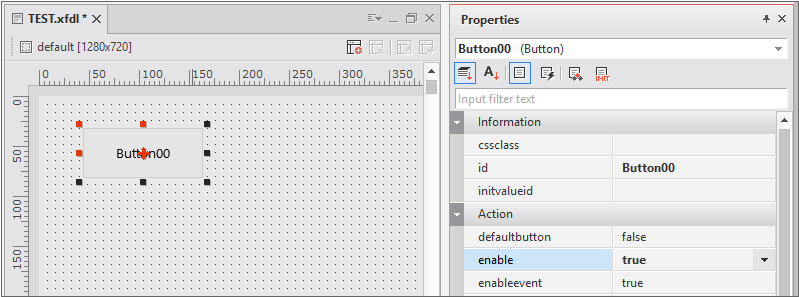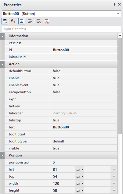 When the default value of the component is modified, the property value is displayed in bold font. The property values of id, text, left, top, width, and height are displayed in the bold font when they are first placed on the design screen. This is because the id, text property values are specified in the process of placing the component, and Position-related property values are specified according to the placed location.