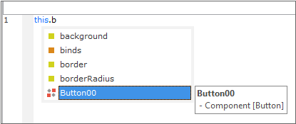 If you enter "." after entering the text "this", a list of the placed components along with the properties, methods, and events of the Form object is displayed. It filters the displayed list according to the characters entered after inputting ".". Select the desired component from the list.