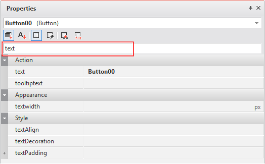 The search window at the top of the property window finds the property items that include items entered as search words. If you enter "text" as the search word, then all property items containing "text" in the property name will be displayed.