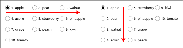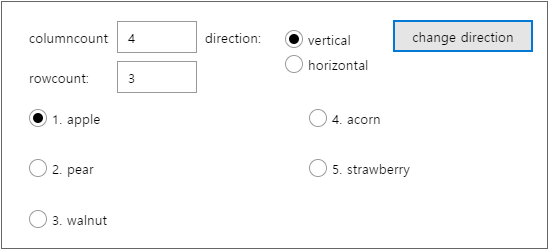 Specifies the direction in which items (data) are displayed on the screen. The default value is "horizontal". One of the misconceptions about the direction property is that when innerdataset is set and displayed on the screen, the data is displayed vertically, but why is the default value "horizontal". This is because the definition of that property specifies the direction in which the item is displayed, not the direction of the Radio component. If you look at the example below, then it will be a bit quicker to understand. The value of the columncount property is 3, and only the value of the direction property is changed.