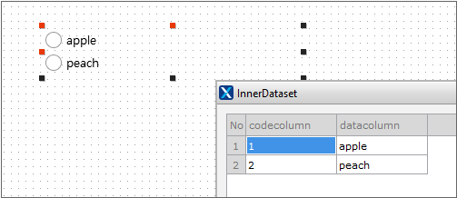 Each of the innerdataset property values of the Radio component (fruit list) that outputs the fruit list is as follows.