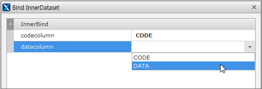 When the Bind InnerDataset window appears, enter or select 'CODE' in codecolumn and 'DATA' in datacolumn. Click the [OK] button to complete the binding.