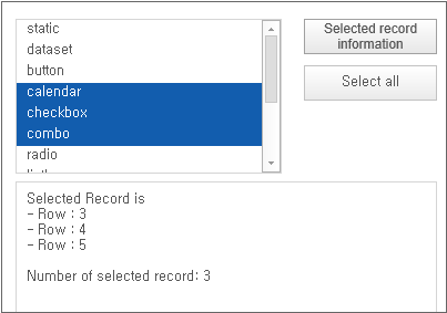 Function to extract the information of the selected item: If you click the Selected record button after selecting the item in ListBox, the row index of the selected item and the number of selected items are displayed in the TextArea component.