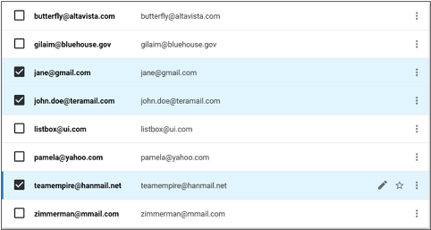 The following shows an example of an address book for webmail. The user views the list of addresses listed on the screen and can specify multiple recipients to whom he/she wants to send mail.