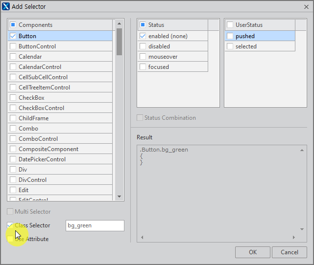 Select the component and state to which the style effect is to be applied in the Add Selector window.