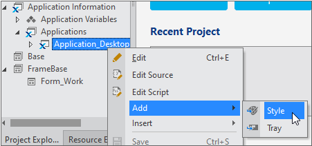 For reference, you can obtain the same result by selecting the Application name and right-clicking to select [Add > Style] from the context menu as follows in Project Explorer.