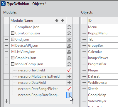 Click the [+] icon next to nexacro.PopupDateRangePicker to add the PopupDateRangePicker component to the Objects list.