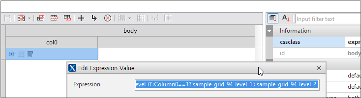 Set the basic conditional expression in the value property of the Edit component as shown below. The conditional expression refers to records in which the Company column is "1dollar" and the Salary column is "2000" or higher. It does not matter if it is arbitrarily changed as the conditional expression for sample operation.