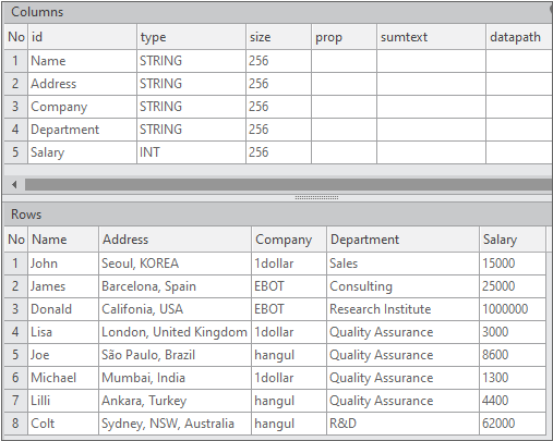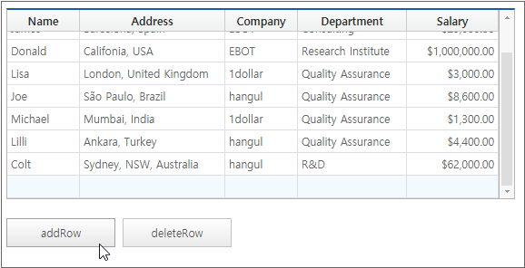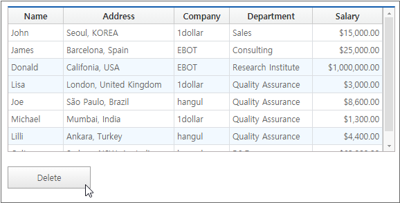 The following is an example of binding Dataset with Name, Address, Company, Department, Salary information to the Grid component.