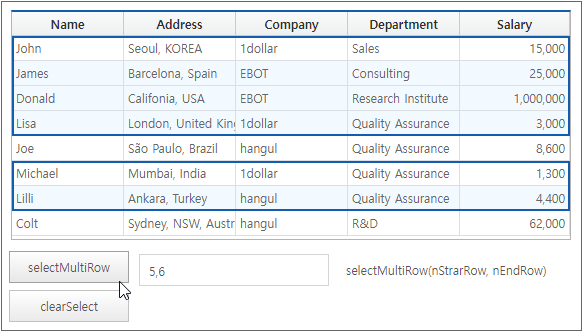 The selectMultiRow method adds a selection area while maintaining the previously selected area. For example, if the selection range is set to "0, 2" for the first run and "4, 5" for the second run, the selected state is displayed as follows.