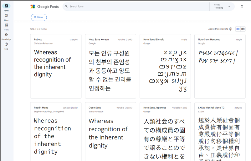 사용자 PC에 해당 폰트가 설치되어 있지 않더라도 공개된 폰트 리소스를 웹에서 내려받아 바로 표시할 수 있습니다. 구글에서는 구글 폰트 사이트를 통해 무료로 사용할 수 있는 웹 폰트 정보를 제공하고 있습니다.