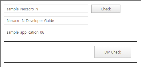 [Check] 버튼 클릭 시 Form의 id, titletext 속성값, Button 컴포넌트의 부모 오브젝트의 id 속성값을 Edit 컴포넌트에 표시합니다. [Div Check] 버튼 클릭 시에는 활성화된 화면(Form)은 Div 내 innerForm 이지만 getActiveForm 메소드에서는 Div 컴포넌트를 포함하고 있는 Form 오브젝트를 반환합니다.