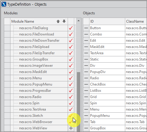 기본 TypeDefinition에는 Sketch 컴포넌트가 등록되어 있지 않습니다. Project Explorer에서 [TypeDefinition > Objects] 항목을 선택하고 에디터를 실행하면 Modules 항목에서 추가되지 않은 오브젝트 목록을 확인할 수 있습니다. 목록에서 "nexacro.Sketch" 항목 옆에 [+] 버튼을 클릭해 오브젝트를 추가합니다.