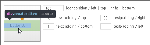 Button 컴포넌트 내 text 요소를 둘러싼 여백을 지정합니다. 아래 그림에서 top, right, bottom 방향의 textpadding 속성값을 지정했을때 초록색으로 표시된 부분이 지정된 여백 영역입니다. 해당 영역이 변경되면서 text 요소의 위치가 변경됩니다.