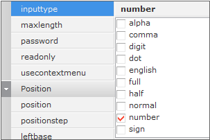 textpadding 속성값을 입력하는 Edit 컴포넌트는 숫자만 입력할 수 있어야 합니다. 이런 경우에는 Spin 컴포넌트를 사용해도 되지만 이번 예제에서는 Edit 컴포넌트를 사용합니다. 먼저 Edit 컴포넌트의 value 속성값을 0으로 지정하고 inputtype 속성값을 "number"로 지정합니다. 넥사크로 스튜디오에서 inputtype 속성값은 목록에서 원하는 항목을 1개 이상 선택할 수 있습니다.