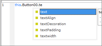 "this."을 입력한 것과 마찬가지로 "this.Button00."을 입력하면 Button 컴포넌트의 속성, 메소드, 이벤트 목록을 보여줍니다. 해당 목록 중에서 text 속성 항목을 선택합니다.
