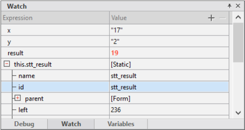 Watch | 특정 변수나 객체의 값을 등록해 놓고 변화되는 값을 관찰할 수 있습니다. 특히 스텝 기능을 사용할 때 유용합니다. |