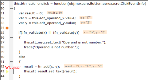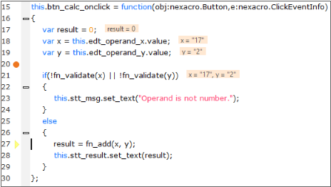 현재 위치인 fn_add 함수가 최상단에 위치하고 그다음으로 fn_add 함수를 호출한 btn_calc_onclick 함수가 위치합니다. 그리고 그 아래에도 여러 함수가 보이는데 이는 넥사크로 내부에서 사용되는 함수들이므로 특별한 경우가 아니면 신경을 쓰지 않아도 됩니다.