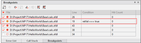 중단점을 지정하면 해당 줄의 앞에 마커가 추가되고 Breakpoints 창에 중단점 정보가 등록됩니다. 또한, 한번 지정된 중단점은 사용자가 삭제하기 전까진 넥사크로 스튜디오를 종료해도 상태가 계속 유지됩니다.