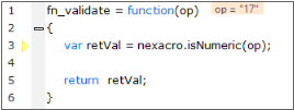 메뉴나 툴바에서 [Step Into]를 선택하면 아래와 같이 fn_validate 함수의 첫 번째 줄로 이동합니다. 만일 한 번 더 [Step Into]를 선택하면 3번 줄을 실행하는데 여기서 다시 isNumeric 함수의 호출이 발생하므로 isNumeric 함수의 첫 번째 줄로 이동하게 됩니다.