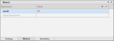 디버깅 모드로 애플리케이션을 실행합니다. 입력과 버튼 클릭이 이뤄지면 34번 줄에서 실행이 멈춥니다. 그럼 Watch 창을 선택한 후 + 버튼을 클릭하거나 마지막 행(Input Expression)을 더블 클릭하여 다음과 같이 result 변수를 등록합니다.