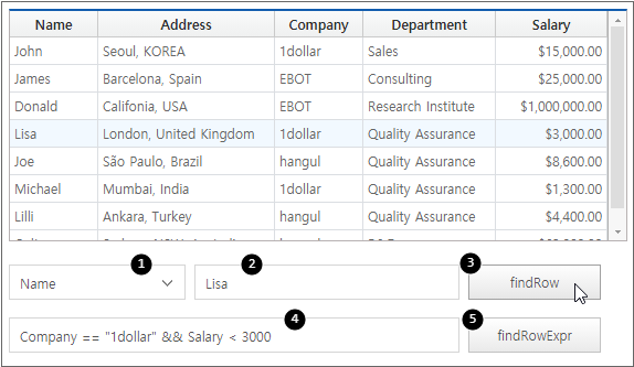 사용자가 1에서 칼럼을 선택하고, 2에 조건 값을 기술한 후 3findRow 버튼을 누릅니다. 조건에 맞는 로우로 포커스가 이동합니다.