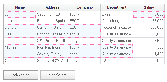 selectMultiRow 메소드는 기존에 선택되어 있던 영역이 유지된 상태에서 선택영역이 추가됩니다. 예를 들어 첫 번째 실행 시 선택 범위를 "0, 2"로 설정하고 두 번째 실행 시 "4, 5"로 설정한 경우에는 아래와 같이 선택된 상태가 표시됩니다.