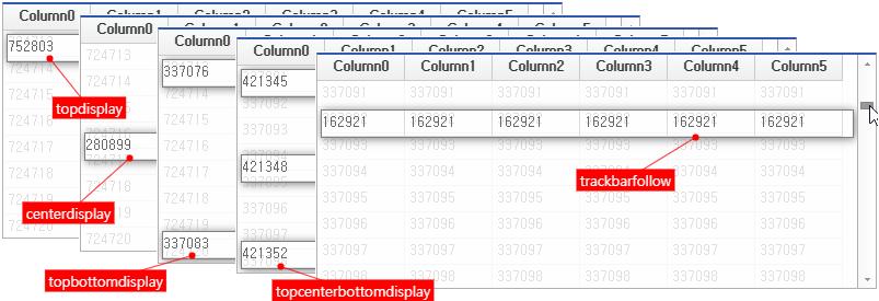 Grid 컴포넌트 아래에 있는 버튼을 클릭하거나 마우스 휠 동작으로 움직이거나 트랙바를 잡아서 끌어 이동할때 오른쪽 Grid 컴포넌트는 한 행씩 움직입니다.