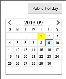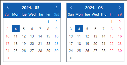 첫 번째 Calendar 컴포넌트는 기본 테마에서 제공하는 휴일 표시이고 두 번째 Calendar 컴포넌트는 금요일, 토요일을 휴일로 표시하고 있습니다.
