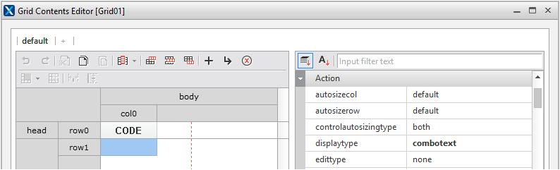 Dataset 오브젝트를 마우스 왼쪽 버튼으로 누른 상태로 드래그해서 Grid 컴포넌트 위로 가져가면 바인딩 작업이 처리됩니다. 첫번째 Grid 컴포넌트는 바인딩까지만 처리하고 두번째 Grid 컴포넌트는 해당 CODE 값을 텍스트로 보여주도록 수정합니다. Grid 컴포넌트를 더블클릭해서 Grid Contents Editor를 실행하고 아래 속성값을 수정합니다.