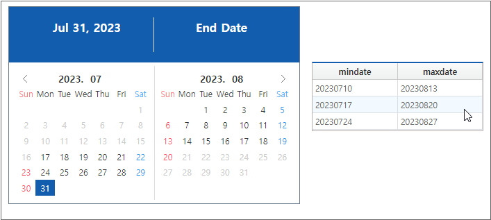 오른쪽 표에서 선택한 mindate, maxdate 속성값에 따라 해당 범위 이외의 날짜는 선택할 수 없는 상태가 됩니다.