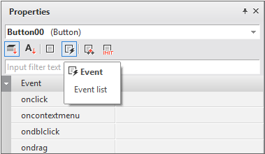 디자인 화면에 Button 컴포넌트를 2개 배치합니다. 배치된 Button 컴포넌트 중 하나를 선택하고 속성창에서 이벤트 아이콘을 선택합니다. 이벤트 항목 중 onclick 이벤트를 선택하고 이벤트 함수를 생성합니다. 이벤트 함수명은 자동으로 생성하지 않고 "Button_onclick"으로 지정합니다.
