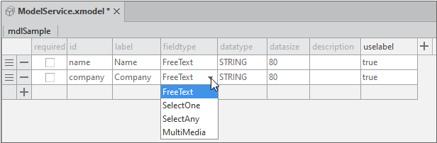 Click the [+] button on the left of the Model setting screen to add a Field List item.