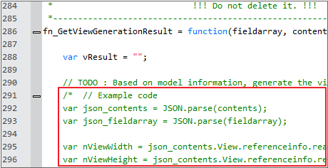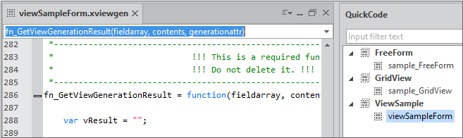 When you create the View template in View Template Wizard or double-click the View template item in the QuickCode panel, a file called [File Name].xviewgen is opened in the edit window. You can edit the script to implement the desired function.