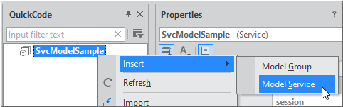 Click the Save icon in the menu to save the settings. Double-click the Model item in the QuickCode panel Model tab to display the Model and Model Service setting screen again.