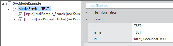 In the model service editing state, you can set service-related properties in the properties window. Set ID, Name, Url property values.