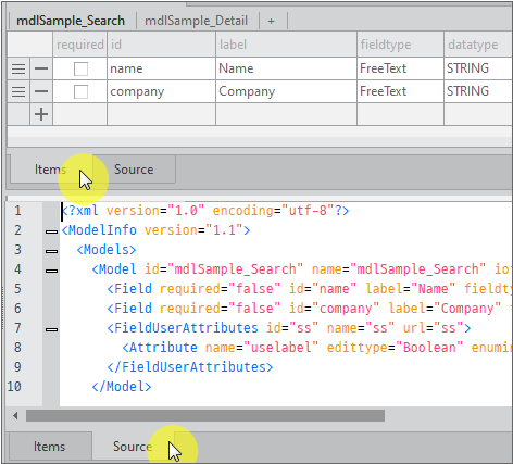 If you change the tab at the bottom of the Model setting screen to 'Source', the generated source code is displayed. You can edit the source code directly and change the bottom tab to "Items" to see the modifications.