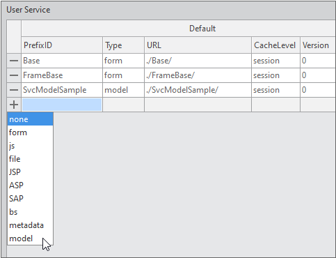 Add the service to the User Service item. Select "model" for the Type item and set the PrefixID.