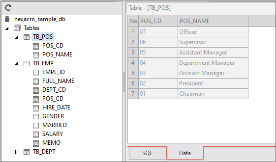 You can separately define parameters used for writing queries. Set the value of the parameters property as presented below. If you add a parameter in the format like :POS_CD to a query statement, the parameters defined by the parameters property will be used when the query is executed.