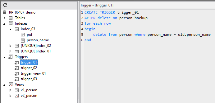 If the database includes indexes, triggers and views, you can also see the relevant information.