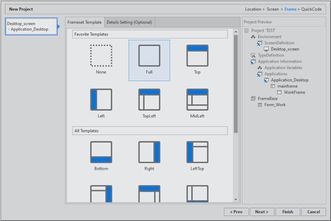 If you select a template other than 'none', Nexacro Studio will create a service named 'Frame' and a Form for each frame automatically. Click the 'Details Setting' tab to adjust detailed settings.
