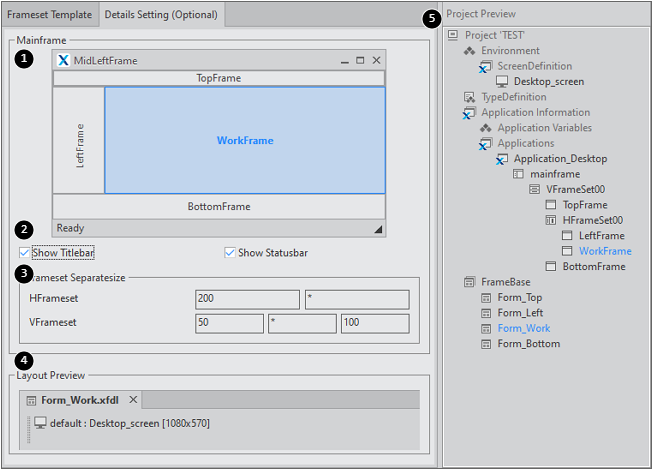 1 | Frame Preview | Preview of an application's frame structure. You can select a ChildFrame through the Frame Preview, Project Preview or Layout Previw. |